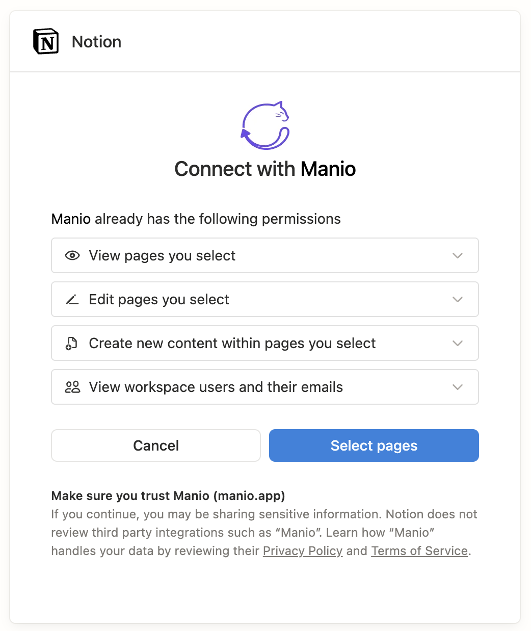 Go to "Destinations" and add Notion. Authorise Manio through the official Notion OAuth flow. Select the workspace and the specific database you created in Step 1.