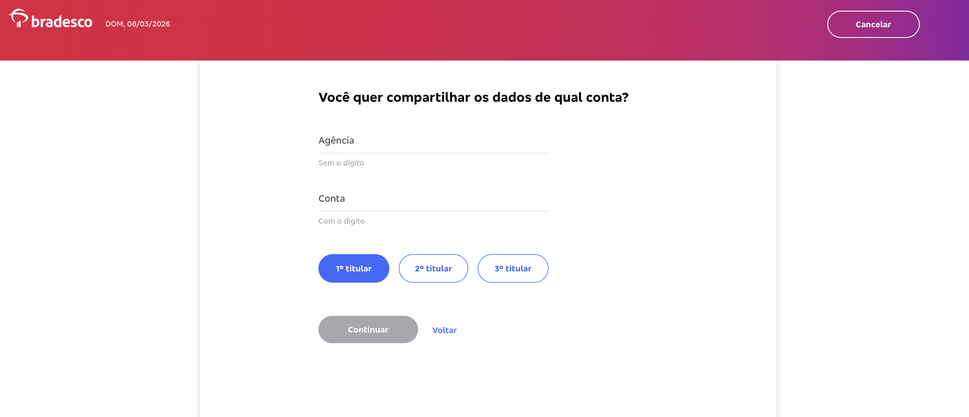 On the consent screen, you choose which accounts to share: checking account (conta corrente), savings (poupança), credit cards, or all of them. Bradesco issues credit cards across multiple networks (Visa, Mastercard, Elo, and American Express), and all are available through Open Finance.